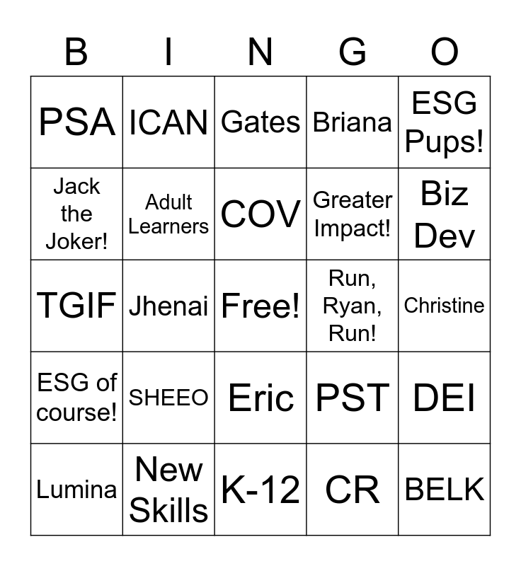 This bingo card has a free space and 24 words: SHEEO, New Skills, COV, Lumina, ESG Pups!, PSA, Jack the Joker!, ICAN, Run, Ryan, Run!, Eric, Greater Impact!, TGIF, PST, DEI, Adult Learners, CR, Christine, Gates, Biz Dev, Jhenai, BELK, ESG of course!, Briana and K-12.