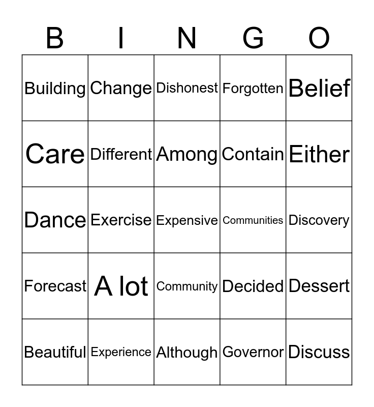This bingo card has 25 words: A lot, Although, Among, Beautiful, Belief, Building, Care, Change, Communities, Community, Contain, Dance, Decided, Dessert, Different, Discuss, Discovery, Dishonest, Either, Exercise, Expensive, Experience, Forecast, Forgotten and Governor.