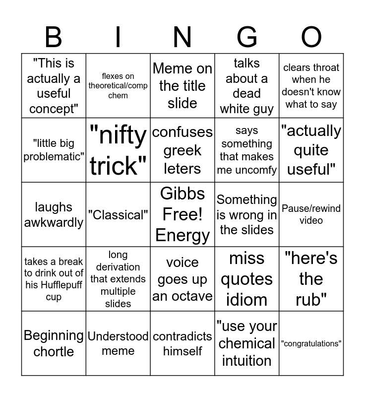 This bingo card has a free space and 29 words: Beginning chortle, "Take care, and stay healthy", "Classical", Any type of stuttering, "This is actually a useful concept", Meme on the title slide, "nifty trick", long derivation that extends multiple slides, Something is wrong in the slides, Understood meme, Pause/rewind video, "congratulations", contradicts himself, "use your chemical intuition, "actually quite useful", "woohoo", voice goes up an octave, takes a break to drink out of his Hufflepuff cup, clears throat when he doesn't know what to say, laughs awkwardly, miss quotes idiom, says incoherent sentence, says something that makes me uncomfy, "little big problematic", talks about a dead white guy, flexes on theoretical/comp chem, "here's the rub", confuses greek leters and calls himself a nerd.