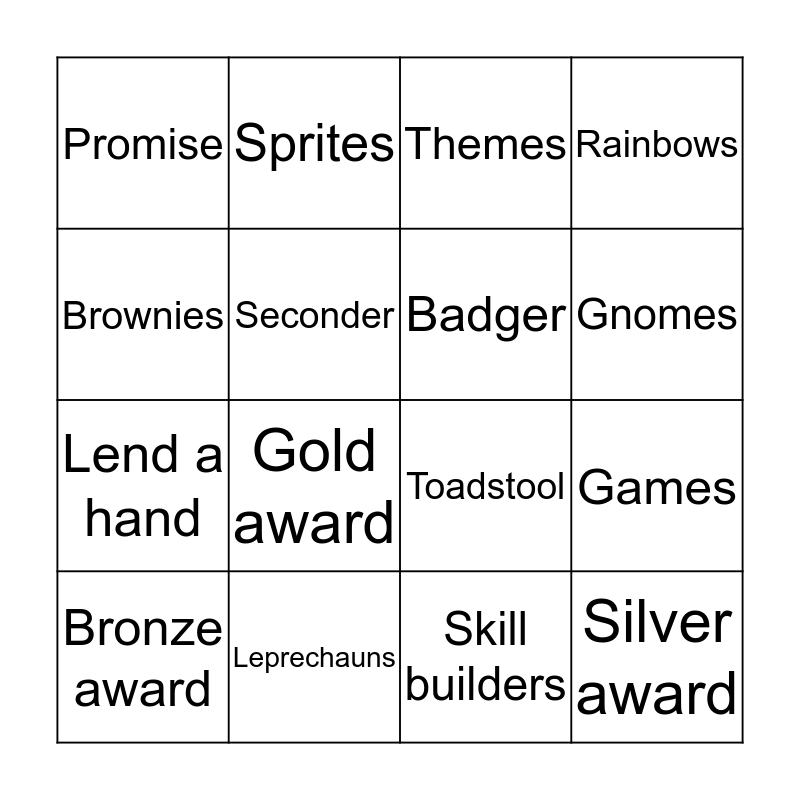This bingo card has 24 words: Sixer, Badges, Gnomes, Imps, Brownies, Promise, Seconder, Sprites, Leprechauns, Law, Lend a hand, Toadstool, Free!, Tawny, Badger, Squirrel, Skill builders, Themes, Gold award, Games, Bronze award, Silver award, Rainbows and Guides.