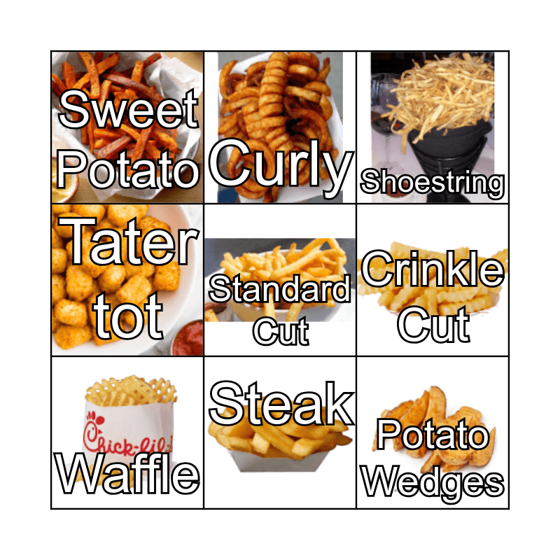This bingo card has 9 images and 9 words: Waffle, Shoestring, Curly, Tater tot, Sweet Potato, Crinkle Cut, Standard Cut, Potato Wedges and Steak.