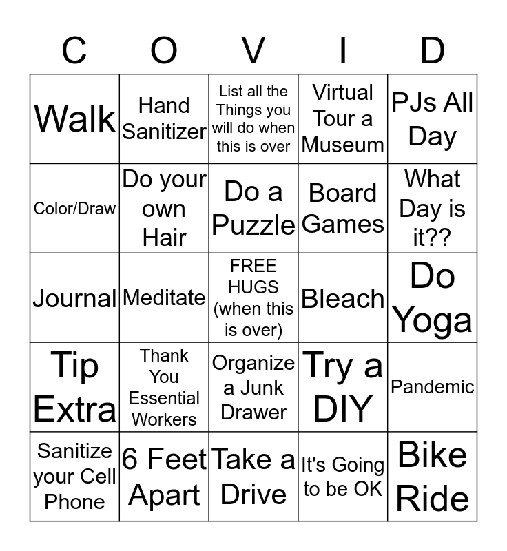 This bingo card has a free space and 64 words: Wash Hands, Lysol, Vitamin C, Pandemic, Stay Home, Flatten the Curve, Hand Sanitizer, Watch a Squirrel, Do a Puzzle, Make a TikTok Video, Organize a Junk Drawer, Nap, Do Yoga, PJs All Day, Binge Watch a Show, Color/Draw, Meditate, Walk, Read, Board Games, Thank You Essential Workers, Tip Extra, Virtual Tour a Museum, Gloves, Day Drinking is OK, Send Handwritten Letters, Don't Touch your Face, "Maybe this will Bring us Closer", Someone on your timeline thinks Covid is a Hoax, Sniffle and wonder if you have Corona, Social Distancing, Use SOAP, Watch Tiger King, I Miss You, What Day is it??, Sanitize your Cell Phone, Online Shopping, It's Going to be OK, You are Loved, Do your own Hair, Journal, Bleach, Family Time, Distance Learning, Toilet Paper, Bike Ride, 6 Feet Apart, Listen to Music, Try a DIY, Paper Towels, Eat, Hydrate, Take a Drive, Rearrange Furniture, Be Safe, Stay Healthy, List all the Things you will do when this is over, Virus, Wanna Run Away, But Can't, Love Your People, Quarantine, Spend Endless amounts of time on Facebook, Be in The Moment and Stimulus Check.