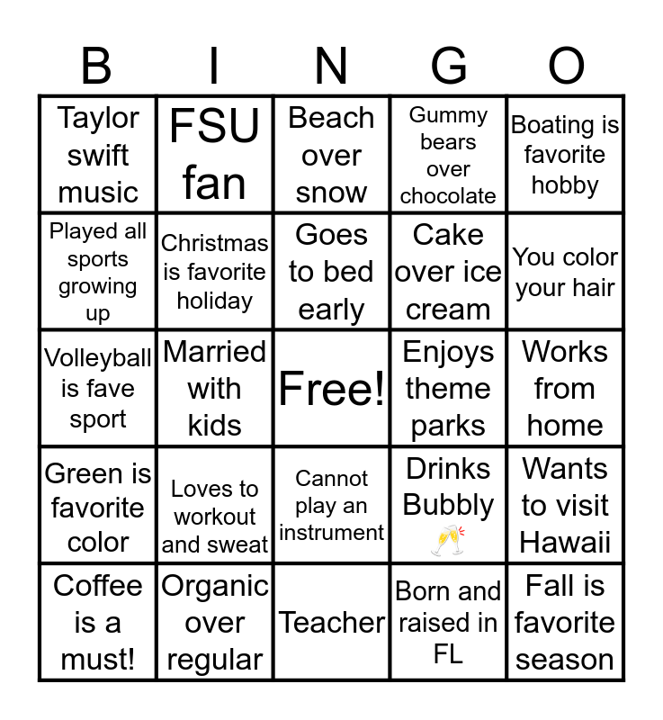 This bingo card has a free space and 24 words: Loves to workout and sweat, Organic over regular, Goes to bed early, Coffee is a must!, Boating is favorite hobby, Taylor swift music, Played all sports growing up, FSU fan, Enjoys theme parks, Cannot play an instrument, Cake over ice cream, Volleyball is fave sport, Drinks Bubbly🥂, Wants to visit Hawaii, Christmas is favorite holiday, Born and raised in FL, Works from home, Beach over snow, You color your hair, Married with kids, Fall is favorite season, Green is favorite color, Gummy bears over chocolate and Teacher.