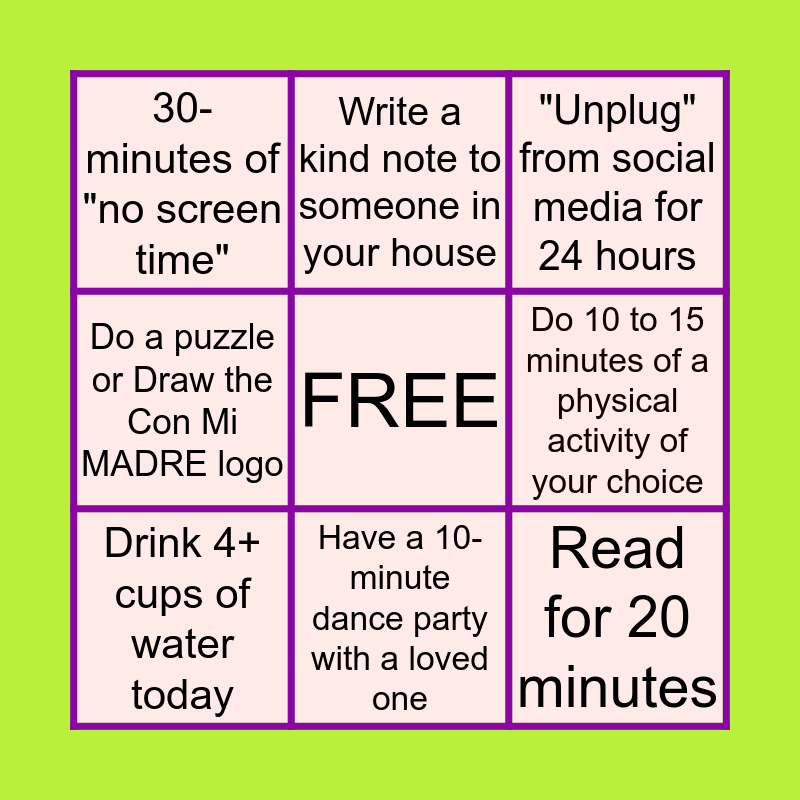 This bingo card has a free space and 8 words: Do 10 to 15 minutes of a physical activity of your choice, "Unplug" from social media for 24 hours, Write a kind note to someone in your house, Drink 4+ cups of water today, 30- minutes of "no screen time", Read for 20 minutes, Do a puzzle or Draw the Con Mi MADRE logo and Have a 10-minute dance party with a loved one.