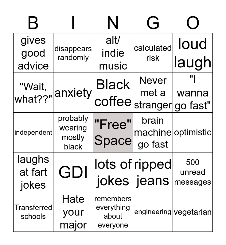 This bingo card has a free space and 24 words: GDI, Hate your major, Black coffee, Transferred schools, loud laugh, gives good advice, "Wait, what??", disappears randomly, brain machine go fast, lots of jokes, Never met a stranger, independent, ripped jeans, 500 unread messages, anxiety, engineering, optimistic, alt/ indie music, "I wanna go fast", probably wearing mostly black, vegetarian, laughs at fart jokes, calculated risk and remembers everything about everyone.
