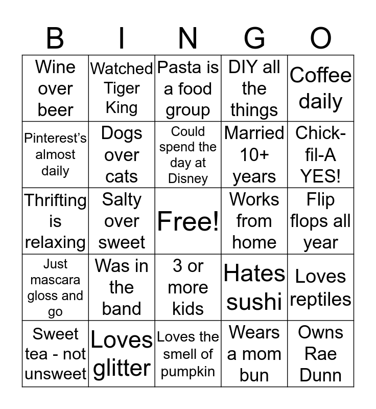 This bingo card has a free space and 24 words: Was in the band, Loves glitter, Could spend the day at Disney, Sweet tea - not unsweet, Coffee daily, Wine over beer, Pinterest’s almost daily, Watched Tiger King, Works from home, 3 or more kids, Married 10+ years, Thrifting is relaxing, Hates sushi, Loves reptiles, Dogs over cats, Wears a mom bun, Flip flops all year, Pasta is a food group, Chick-fil-A YES!, Salty over sweet, Owns Rae Dunn, Just mascara gloss and go, DIY all the things and Loves the smell of pumpkin.