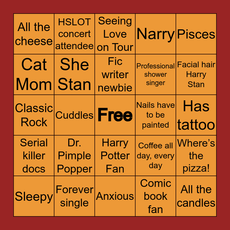 This bingo card has a free space and 24 words: Dr. Pimple Popper, Forever single, Fic writer newbie, Sleepy, Pisces, All the cheese, Cat Mom, HSLOT concert attendee, Nails have to be painted, Harry Potter Fan, Professional shower singer, Classic Rock, Coffee all day, every day, Where’s the pizza!, She Stan, Comic book fan, Has tattoo, Seeing Love on Tour, Facial hair Harry Stan, Cuddles, All the candles, Serial killer docs, Narry and Anxious.