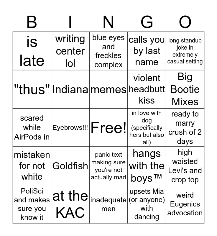 This bingo card has a free space and 24 words: Goldfish, at the KAC, memes, PoliSci and makes sure you know it, long standup joke in extremely casual setting, is late, "thus", writing center lol, in love with dog (specifically hers but also all), panic text making sure you're not actually mad, violent headbutt kiss, scared while AirPods in, hangs with the boys™, high waisted Levi's and crop top, Indiana, upsets Mia (or anyone) with dancing, ready to marry crush of 2 days, blue eyes and freckles complex, Big Bootie Mixes, Eyebrows!!!, weird Eugenics advocation, mistaken for not white, calls you by last name and inadequate men.