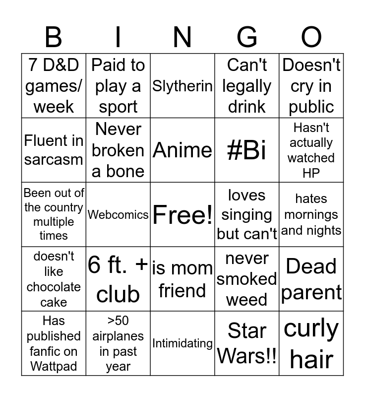 This bingo card has a free space and 24 words: 6 ft. + club, >50 airplanes in past year, Anime, Has published fanfic on Wattpad, Doesn't cry in public, 7 D&D games/ week, Fluent in sarcasm, Paid to play a sport, loves singing but can't, is mom friend, #Bi, Been out of the country multiple times, never smoked weed, Dead parent, Never broken a bone, Star Wars!!, hates mornings and nights, Slytherin, Hasn't actually watched HP, Webcomics, curly hair, doesn't like chocolate cake, Can't legally drink and Intimidating.
