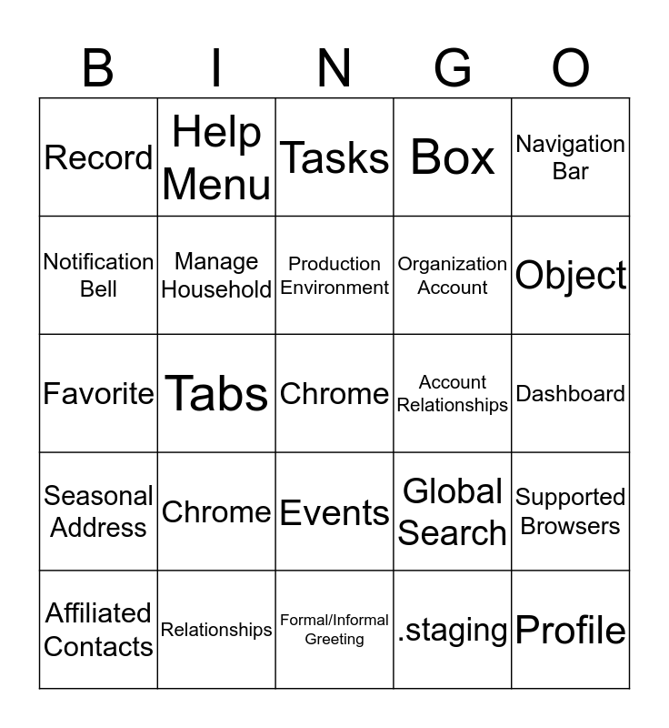 This bingo card has 42 words: Free!, Production Environment, Sandbox Environment, Chrome, .staging, Supported Browsers, Chrome, Recent Items, Tasks, Events, Dashboard, Object, Tabs, Navigation Bar, App Launcher, Global Search, Wildcard Search (*), Favorite, Quick Actions, Help Menu, Notification Bell, Change your password, Profile, Record, List View, Related List, Organization Account, Partner Account, Household Account, Contact, Address Management, Seasonal Address, Manage Household, Formal/Informal Greeting, Organization Affiliation, Affiliated Contacts, Relationships, Account Relationships, Notes, Files, Box and Trailhead.
