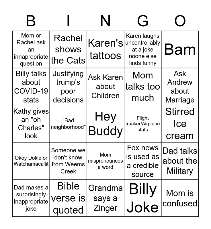 This bingo card has a free space and 27 words: Fox news is used as a credible source, Mary is "Confidently incorrect", Mom talks too much, Grandma says a Zinger, Billy talks about COVID-19 stats, Karen's tattoos, Rachel shows the Cats, Okey Dokle or Watchamacallit, Flight tracker/Airplane stats, Dad talks about the Military, Kathy gives an "oh Charles" look, Karen laughs uncontrollably at a joke noone else finds funny, Dad makes a surprisingly inappropriate joke, Bible verse is quoted, Ask Andrew about Marriage, Bad medical Advice, Justifying trump's poor decisions, Ask Karen about Children, Someone we don't know from Weems Creek, Mom or Rachel ask an innapropriate question, Stirred Ice cream, Billy Joke, "Bad neighborhood", Mom is confused, Mom mispronounces a word, Bam and Struggling with technology.