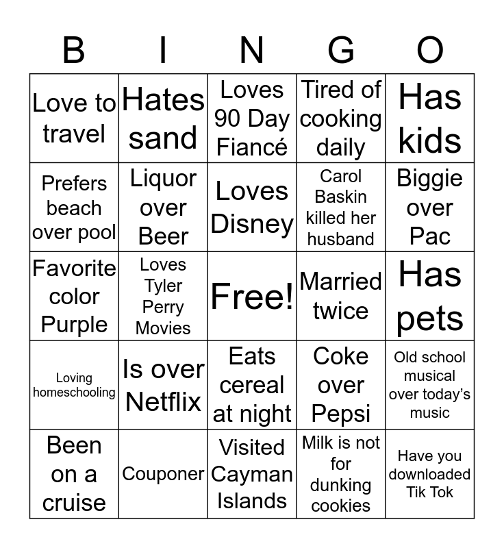 This bingo card has a free space and 24 words: Is over Netflix, Couponer, Loves Disney, Been on a cruise, Has kids, Love to travel, Prefers beach over pool, Hates sand, Married twice, Eats cereal at night, Carol Baskin killed her husband, Favorite color Purple, Coke over Pepsi, Old school musical over today’s music, Liquor over Beer, Milk is not for dunking cookies, Has pets, Loves 90 Day Fiancé, Biggie over Pac, Loves Tyler Perry Movies, Have you downloaded Tik Tok, Loving homeschooling, Tired of cooking daily and Visited Cayman Islands.