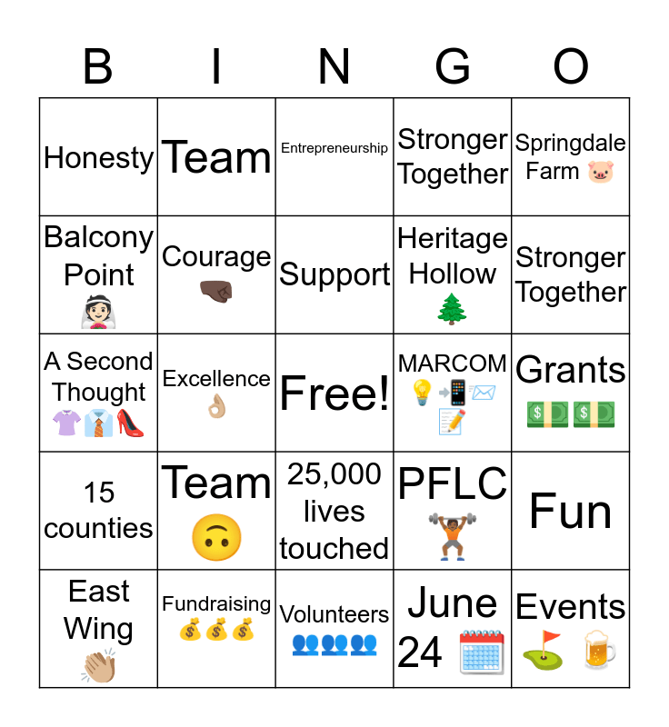 This bingo card has a free space and 29 words: East WingππΌ, Raiserβs Edge β€οΈ, Excellence ππΌ, Christian Compassion ππ½, Honesty, Entrepreneurship, Courage π€πΏ, Team π, MARCOM π‘π²π¨π, Fundraising π°π°π°, Grants π΅π΅, Events β³οΈ πΊ, Volunteers π₯π₯π₯, June 24 π, Stronger Together, 35 years π, 25,000 lives touched, 15 counties, Springdale Farm π·, A Second Thought πππ , PFLC ππΎ, Heritage Christian Stables π, Heritage Hollow π², Balcony Point π°π», Stronger Together, Team, Fun, Support and Relationships.