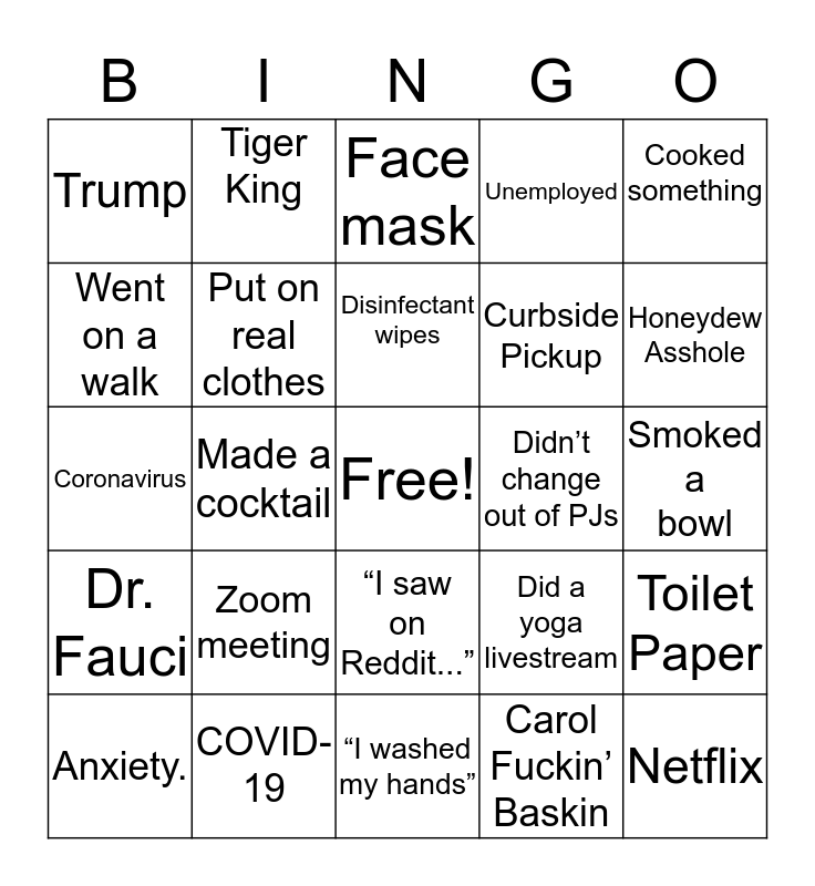 This bingo card has a free space and 24 words: Zoom meeting, COVID-19, Disinfectant wipes, Anxiety., Cooked something, Trump, Went on a walk, Tiger King, Didn’t change out of PJs, “I saw on Reddit...”, Curbside Pickup, Coronavirus, Did a yoga livestream, Toilet Paper, Put on real clothes, Carol Fuckin’ Baskin, Smoked a bowl, Face mask, Honeydew Asshole, Made a cocktail, Netflix, Dr. Fauci, Unemployed and “I washed my hands”.