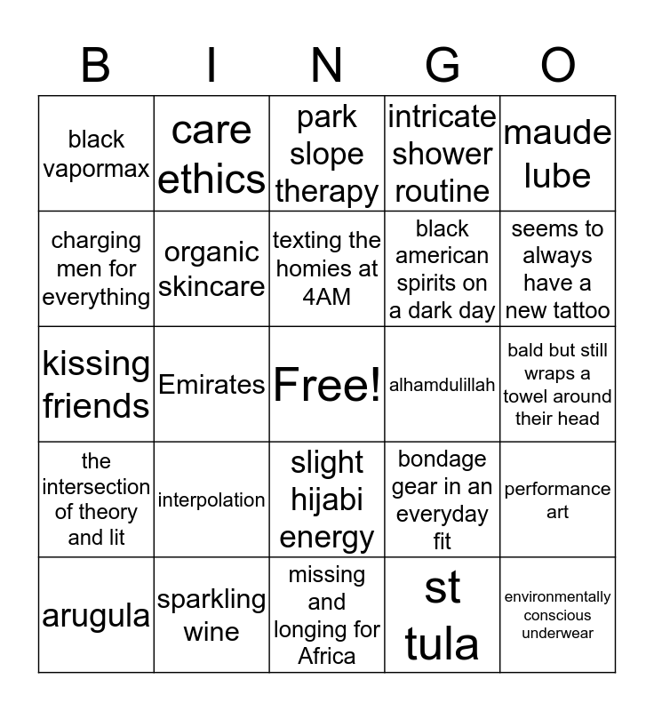 This bingo card has a free space and 24 words: interpolation, sparkling wine, texting the homies at 4AM, arugula, maude lube, black vapormax, charging men for everything, care ethics, alhamdulillah, slight hijabi energy, black american spirits on a dark day, kissing friends, bondage gear in an everyday fit, performance art, organic skincare, st tula, bald but still wraps a towel around their head, park slope therapy, seems to always have a new tattoo, Emirates, environmentally conscious underwear, the intersection of theory and lit, intricate shower routine and missing and longing for Africa.