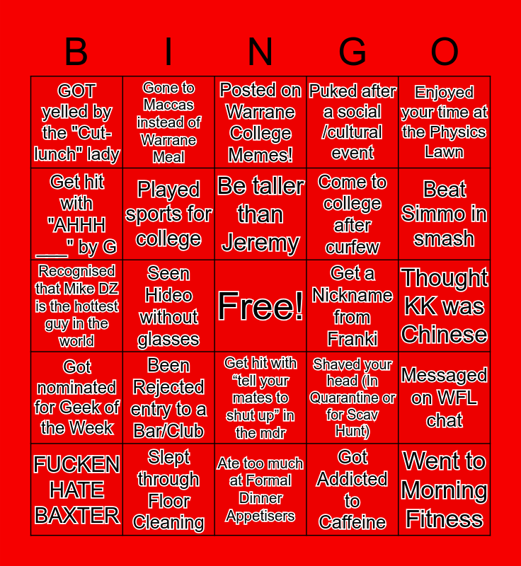 This bingo card has a free space and 24 words: FUCKEN HATE BAXTER, Been Rejected entry to a Bar/Club, Be taller than Jeremy, Got Addicted to Caffeine, Enjoyed your time at the Physics Lawn, GOT yelled by the "Cut-lunch" lady, Gone to Maccas instead of Warrane Meal, Posted on Warrane College Memes!, Get a Nickname from Franki, Thought KK was Chinese, Recognised that Mike DZ is the hottest guy in the world, Played sports for college, Shaved your head (In Quarantine or for Scav Hunt), Messaged on WFL chat, Get hit with "AHHH ___" by G, Slept through Floor Cleaning, Ate too much at Formal Dinner Appetisers, Puked after a social /cultural event, Beat Simmo in smash, Got nominated for Geek of the Week, Seen Hideo without glasses, Get hit with “tell your mates to shut up” in the mdr, Come to college after curfew and Went to Morning Fitness.