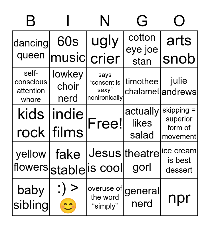 This bingo card has a free space and 24 words: fake stable, :) > 😊, says “consent is sexy” nonironically, baby sibling, arts snob, dancing queen, self-conscious attention whore, 60s music, actually likes salad, Jesus is cool, timothee chalamet, kids rock, theatre gorl, ice cream is best dessert, lowkey choir nerd, general nerd, skipping = superior form of movement, ugly crier, julie andrews, indie films, npr, yellow flowers, cotton eye joe stan and overuse of the word “simply”.