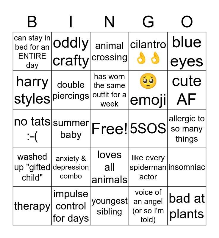 This bingo card has a free space and 24 words: anxiety & depression combo, impulse control for days, has worn the same outfit for a week, therapy, blue eyes, can stay in bed for an ENTIRE day, harry styles, oddly crafty, 5SOS, loves all animals, 🥺 emoji, no tats :-(, like every spiderman actor, insomniac, double piercings, voice of an angel (or so I'm told), allergic to so many things, animal crossing, cute AF, summer baby, bad at plants, washed up "gifted child", cilantro 👌👌 and youngest sibling.