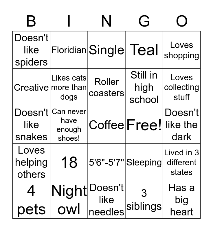 This bingo card has a free space and 24 words: 18, Night owl, Roller coasters, 4 pets, Loves shopping, Doesn't like spiders, Creative, Floridian, Free!, 5'6"-5'7", Still in high school, Doesn't like snakes, Sleeping, Lived in 3 different states, Likes cats more than dogs, 3 siblings, Doesn't like the dark, Single, Loves collecting stuff, Can never have enough shoes!, Has a big heart, Loves helping others, Teal and Doesn't like needles.