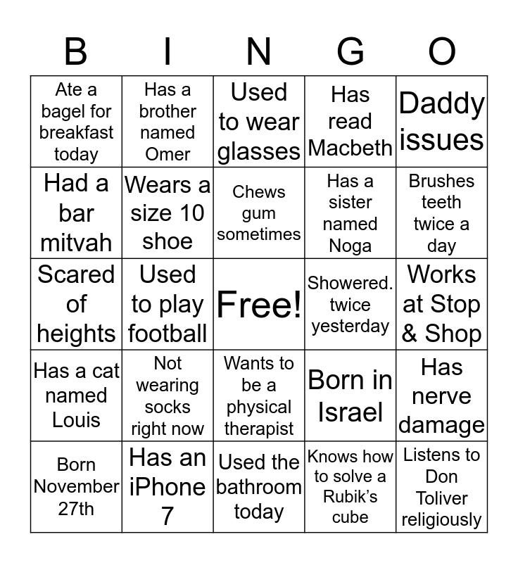 This bingo card has a free space and 24 words: Born November 27th, Not wearing socks right now, Chews gum sometimes, Knows how to solve a Rubik’s cube, Daddy issues, Ate a bagel for breakfast today, Has a brother named Omer, Used to wear glasses, Showered. twice yesterday, Works at Stop & Shop, Scared of heights, Wears a size 10 shoe, Born in Israel, Has nerve damage, Had a bar mitvah, Has an iPhone 7, Used the bathroom today, Has read Macbeth, Brushes teeth twice a day, Has a cat named Louis, Used to play football, Wants to be a physical therapist, Has a sister named Noga and Listens to Don Toliver religiously.
