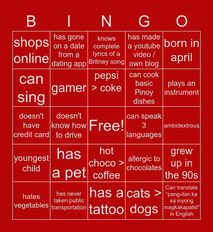 This bingo card has a free space and 24 words: has a pet, has never taken public transportation, pepsi > coke, hates vegetables, born in april, shops online, can sing, has gone on a date from a dating app, can speak 3 languages, hot choco > coffee, can cook basic Pinoy dishes, doesn't have credit card, allergic to chocolates, grew up in the 90s, gamer, cats > dogs, ambidextrous, knows complete lyrics of a Britney song, plays an instrument, doesn't know how to drive, Can translate “pang-ilan ka sa inyong magkakapatid” in English, youngest child, has made a youtube video / own blog and has a tattoo.