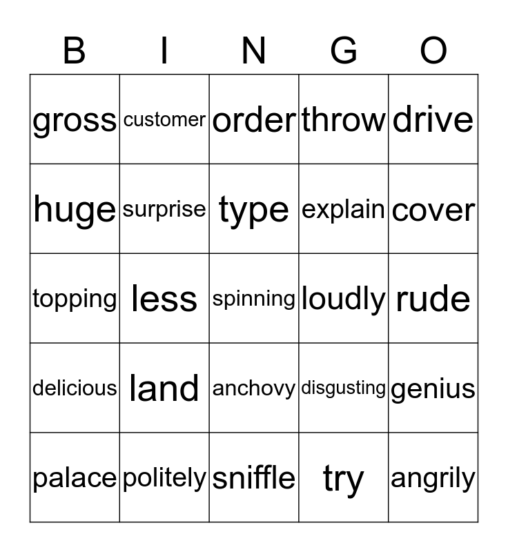 This bingo card has a free space and 34 words: restaurant, try, kind, Chinese, delicious, surprise, drive, palace, customer, moustache, type, order, pilot, fantastic, loudly, cover, politely, topping, land, disgusting, anchovy, splatter, gross, rude, sniffle, angrily, throw, spin, explain, huge, choose, less, genius and promise.