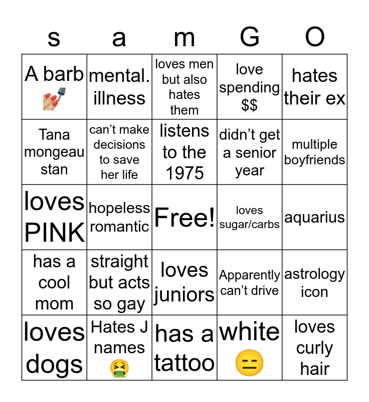 This bingo card has a free space and 24 words: loves dogs, straight but acts so gay, listens to the 1975, white😑, hates their ex, A barb💅🏼, mental. illness, loves men but also hates them, loves sugar/carbs, aquarius, loves PINK, can’t make decisions to save her life, Apparently can’t drive, astrology icon, Tana mongeau stan, Hates J names🤮, has a tattoo, love spending $$, multiple boyfriends, has a cool mom, hopeless romantic, loves juniors, didn’t get a senior year and loves curly hair.