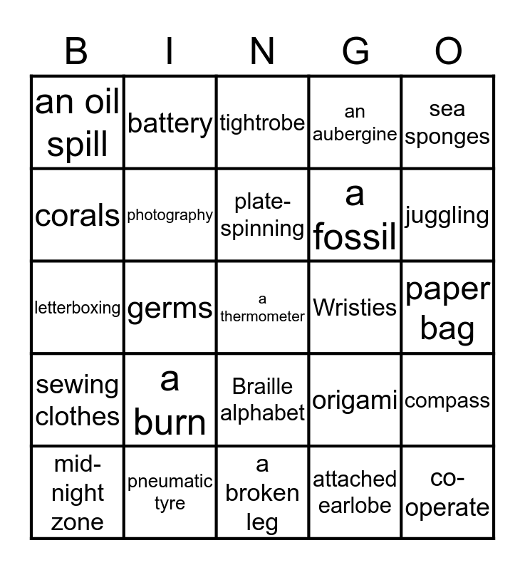 This bingo card has 25 words: a burn, a broken leg, plate-spinning, mid-night zone, sea sponges, an oil spill, corals, battery, Wristies, Braille alphabet, a fossil, letterboxing, origami, compass, photography, co-operate, paper bag, tightrobe, juggling, germs, a thermometer, pneumatic tyre, sewing clothes, an aubergine and attached earlobe.