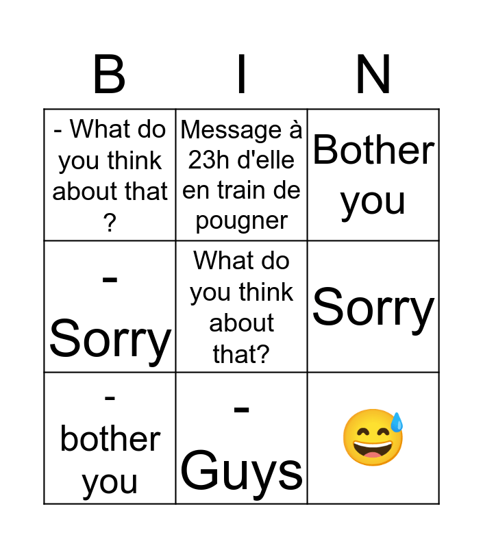 This bingo card has 12 words: Guys, 😅, What do you think about that?, Sorry, Message à 23h d'elle en train de pougner, Bother you, - Guys, - 😅, - What do you think about that ?, - Sorry, - bother you and - Message d'elle à 23h en train de pougner.