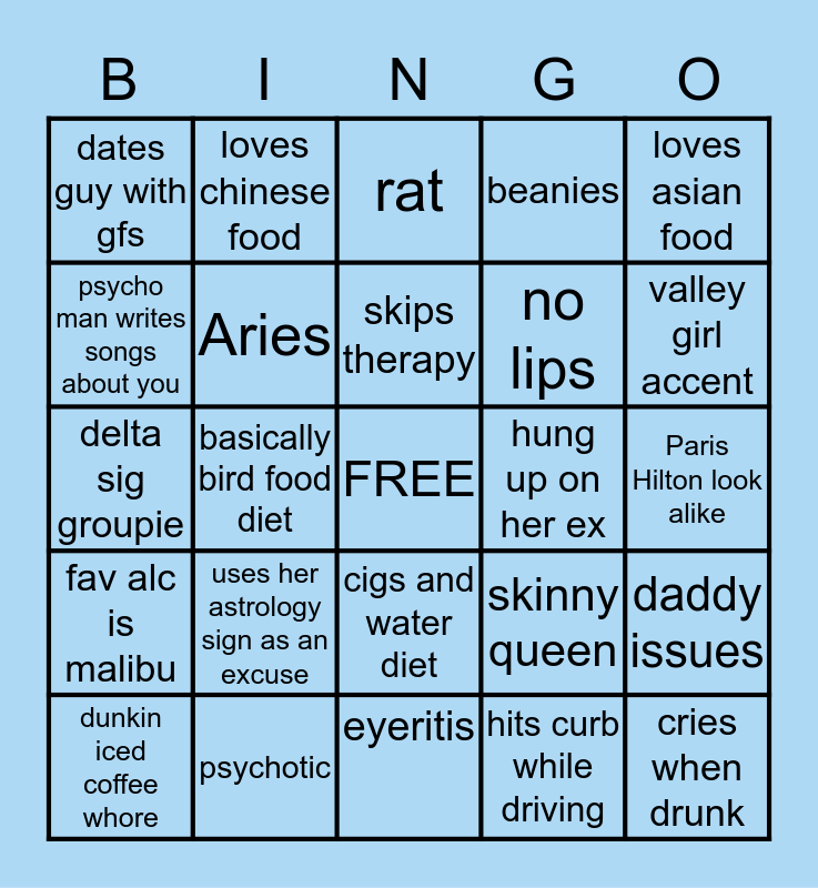 This bingo card has a free space and 24 words: uses her astrology sign as an excuse, psychotic, skips therapy, dunkin iced coffee whore, loves asian food, dates guy with gfs, psycho man writes songs about you, loves chinese food, hung up on her ex, cigs and water diet, no lips, delta sig groupie, skinny queen, daddy issues, Aries, hits curb while driving, Paris Hilton look alike, rat, valley girl accent, basically bird food diet, cries when drunk, fav alc is malibu, beanies and eyeritis.