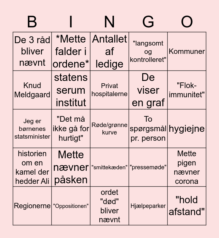 This bingo card has a free space and 38 words: "samfundsind", "stå sammen hver for sig", *bliver stilt et kritisk spørgsmål man ikke kan svare på*, To spørgsmål pr. person, Mette pigen nævner corona, historien om en kamel der hedder Ali, "Det må ikke gå for hurtigt", Børn bliver nævnt, De viser en graf, "Flok-immunitet", Knud Meldgaard, statens serum institut, Hjælpeparker, hygiejne, De 3 råd bliver nævnt, Mette nævner påsken, "genåbning", "langsomt og kontrolleret", *Der er en der hoster*, Jeg er børnenes statsminister, *Mette falder i ordene*, ordet "død" bliver nævnt, "pressemøde", "hold afstand", Retningslinjer, "covid-19", "smittekæden", "sundhedsvæsnet", Smitteopsporing, vaccine, Respirator, Privat hospitalerne, Risikogruppe, Kommuner, Regionerne, "Oppositionen", Antallet af ledige and "anbefalinger".