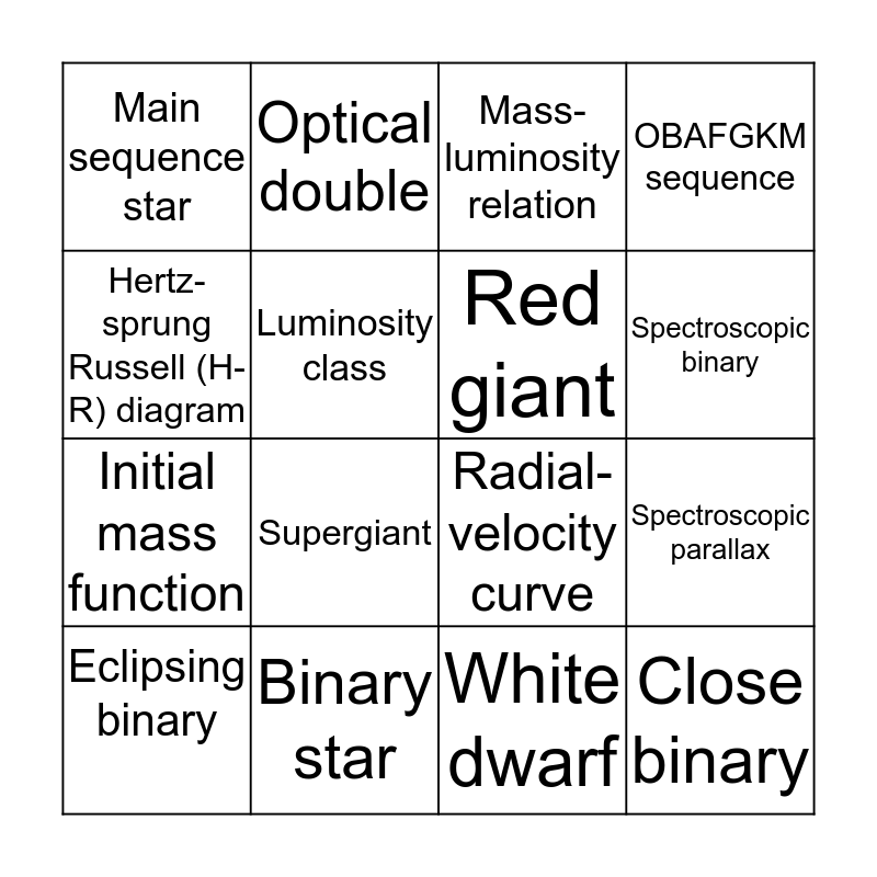This bingo card has 16 words: Binary star, Spectroscopic parallax, Mass-luminosity relation, Main sequence star, Initial mass function, Optical double, Radial-velocity curve, White dwarf, Hertz-sprung Russell (H-R) diagram, Luminosity class, Eclipsing binary, OBAFGKM sequence, Supergiant, Spectroscopic binary, Red giant and Close binary.