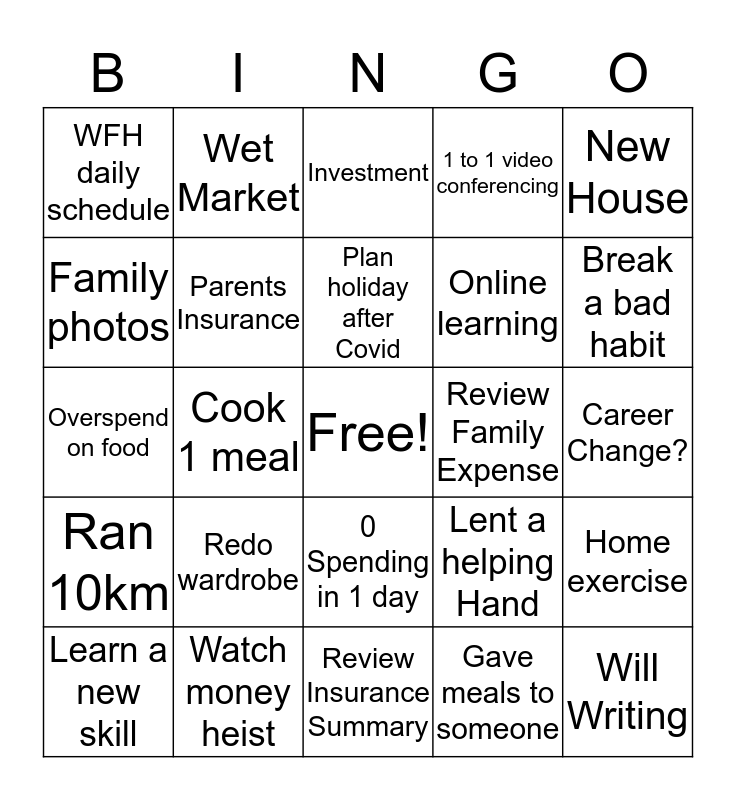 This bingo card has a free space and 24 words: Redo wardrobe, Watch money heist, Plan holiday after Covid, Learn a new skill, New House, WFH daily schedule, Family photos, Wet Market, Review Family Expense, 0 Spending in 1 day, Online learning, Overspend on food, Lent a helping Hand, Home exercise, Parents Insurance, Gave meals to someone, Career Change?, Investment, Break a bad habit, Cook 1 meal, Will Writing, Ran 10km, 1 to 1 video conferencing and Review Insurance Summary.