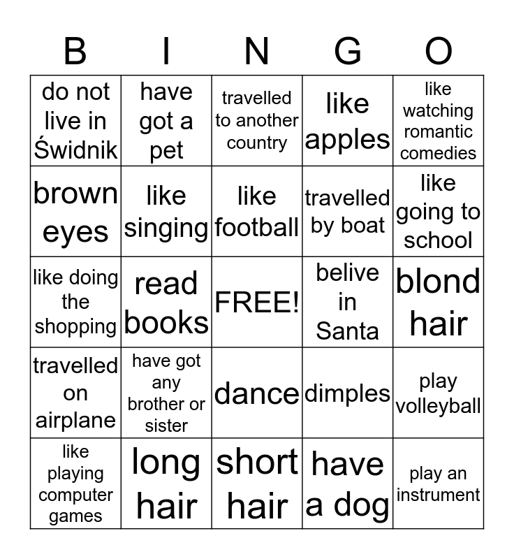 This bingo card has a free space and 24 words: have got any brother or sister, long hair, like football, like playing computer games, like watching romantic comedies, do not live in Świdnik, brown eyes, have got a pet, belive in Santa, dance, travelled by boat, like doing the shopping, dimples, play volleyball, like singing, have a dog, blond hair, travelled to another country, like going to school, read books, play an instrument, travelled on airplane, like apples and short hair.
