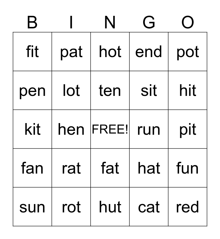 This bingo card has a free space and 24 words: rat, rot, ten, sun, pot, fit, pen, pat, run, fat, sit, kit, hat, fun, lot, cat, pit, hot, hit, hen, red, fan, end and hut.