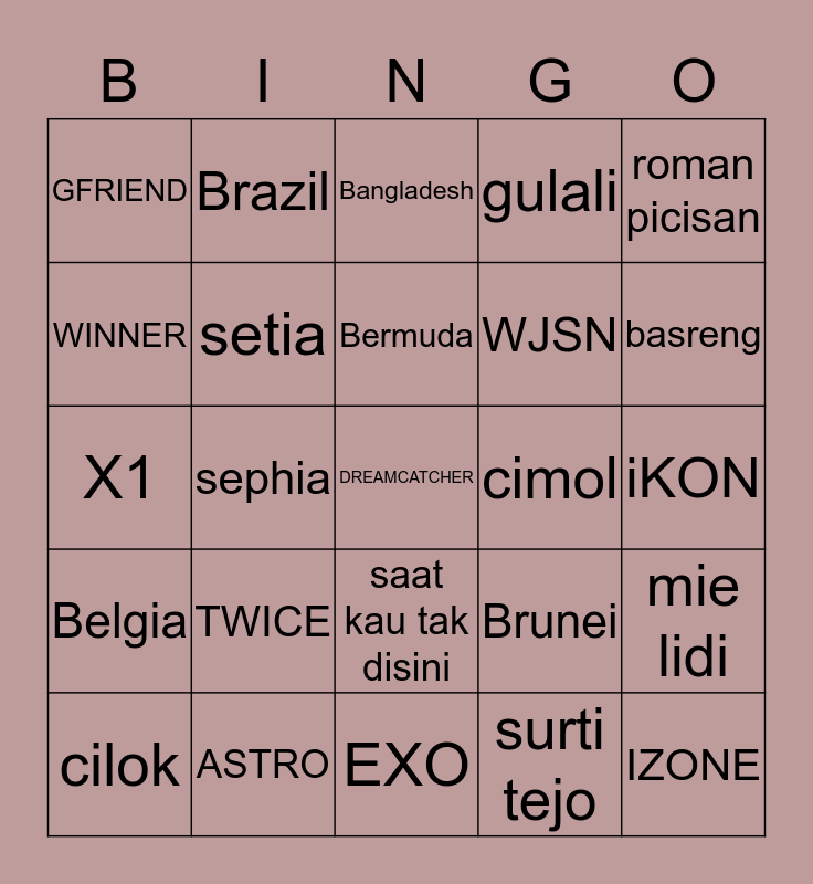 This bingo card has 25 words: TWICE, EXO, Bermuda, cilok, roman picisan, GFRIEND, WINNER, Brazil, cimol, saat kau tak disini, WJSN, X1, Brunei, mie lidi, setia, IZONE, iKON, Bangladesh, basreng, sephia, DREAMCATCHER, ASTRO, Belgia, gulali and surti tejo.