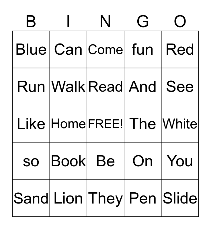 This bingo card has a free space and 24 words: Book, Lion, Read, Sand, Red, Blue, Run, Can, The, Be, And, Like, On, You, Walk, Pen, White, Come, See, Home, Slide, so, fun and They.