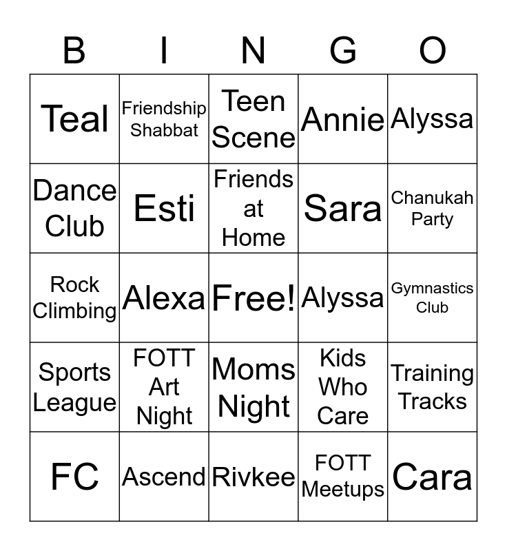 This bingo card has a free space and 57 words: Friendship Circle, FC, Purple, Teal, Rivkee, Rabbi Mordy, Esti, Gila, Sara, Adina, Annie, Paige, Julia, Hayli, Leighann, Emily, Alyssa, Alexa, Drew, Cara, Alyssa, Friends on the Town, Kids Who Care, Teen Scene, Teen Leadership Board, Friends at Home, Friends all Around, Purim Party, Chanukah Party, Sukkot Party, Sunday Circle, Bowling League, Cooking Club, South Hills Programming, Gymnastics Club, Dance Club, Yoga Club, Rock Climbing, Art Club, Sports League, Friendship Shabbat, Moms Night, Dads Night, Book Club, FOTT Trips, FOTT Fit, FOTT Art Night, Ascend, FOTT Cafe, FOTT Dinner, FOTT Movie Night, FOTT Meetups, Family Fun, Welcome Back Apple Picking, Kennywood Day, Training Tracks and Host Committees.
