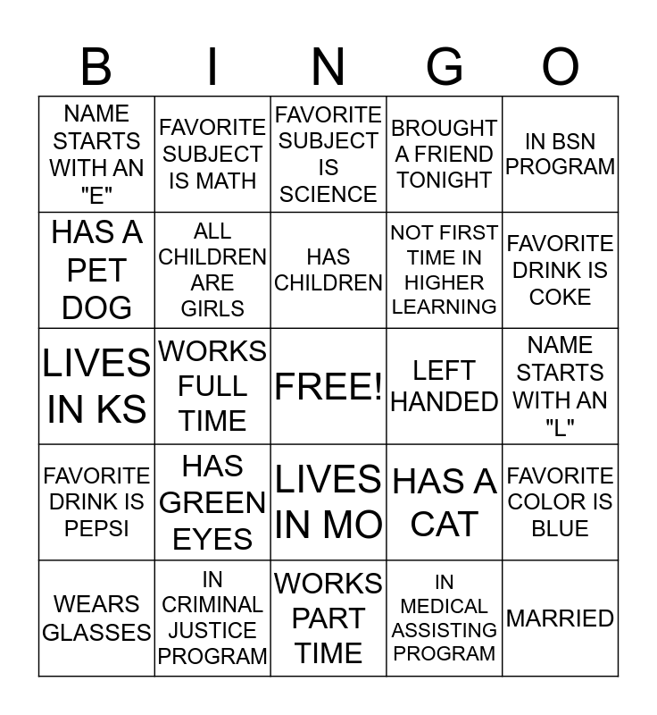 This bingo card has a free space and 24 words: HAS GREEN EYES, IN CRIMINAL JUSTICE PROGRAM, HAS CHILDREN, WEARS GLASSES, IN BSN PROGRAM, NAME STARTS WITH AN "E", HAS A PET DOG, FAVORITE SUBJECT IS MATH, LEFT HANDED, LIVES IN MO, NOT FIRST TIME IN HIGHER LEARNING, LIVES IN KS, HAS A CAT, FAVORITE COLOR IS BLUE, ALL CHILDREN ARE GIRLS, IN MEDICAL ASSISTING PROGRAM, NAME STARTS WITH AN "L", FAVORITE SUBJECT IS SCIENCE, FAVORITE DRINK IS COKE, WORKS FULL TIME, MARRIED, FAVORITE DRINK IS PEPSI, BROUGHT A FRIEND TONIGHT and WORKS PART TIME.