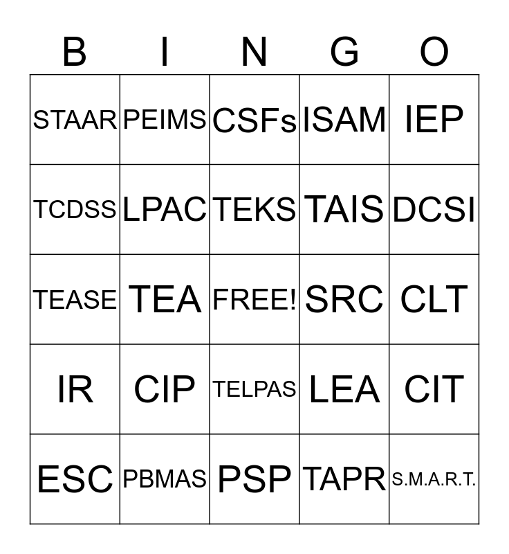 This bingo card has a free space and 24 words: CIP, PBMAS, TEKS, ESC, IEP, STAAR, TCDSS, PEIMS, SRC, TELPAS, TAIS, TEASE, LEA, CIT, LPAC, TAPR, CLT, CSFs, DCSI, TEA, S.M.A.R.T., IR, ISAM and PSP.