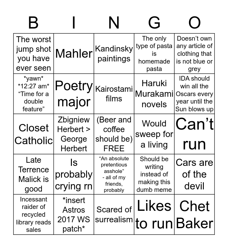 This bingo card has a free space and 24 words: Is probably crying rn, *insert Astros 2017 WS patch*, Kairostami films, Incessant raider of recycled library reads sales, Doesn’t own any article of clothing that is not blue or grey, The worst jump shot you have ever seen, *yawn* *12:27 am* “Time for a double feature”, Mahler, Would sweep for a living, “An absolute pretentious asshole” - all of my friends, probably, Haruki Murakami novels, Closet Catholic, Should be writing instead of making this dumb meme, Cars are of the devil, Poetry major, Likes to run, Can’t run, Kandinsky paintings, IDA should win all the Oscars every year until the Sun blows up, Zbigniew Herbert > George Herbert, Chet Baker, Late Terrence Malick is good, The only type of pasta is homemade pasta and Scared of surrealism.