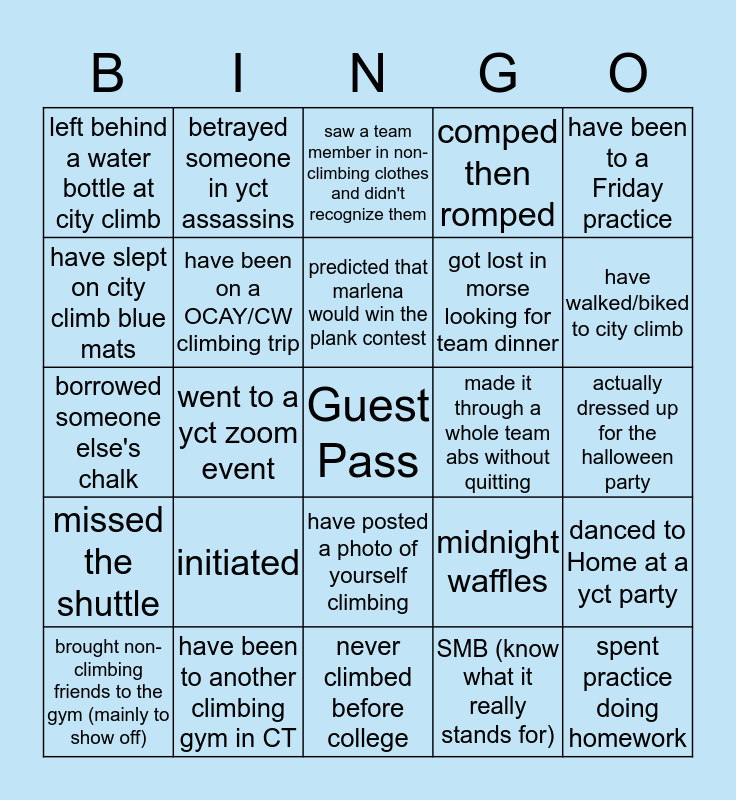 This bingo card has a free space and 24 words: initiated, have been to another climbing gym in CT, predicted that marlena would win the plank contest, brought non-climbing friends to the gym (mainly to show off), have been to a Friday practice, left behind a water bottle at city climb, have slept on city climb blue mats, betrayed someone in yct assassins, made it through a whole team abs without quitting, have posted a photo of yourself climbing, got lost in morse looking for team dinner, borrowed someone else's chalk, midnight waffles, danced to Home at a yct party, have been on a OCAY/CW climbing trip, SMB (know what it really stands for), actually dressed up for the halloween party, saw a team member in non-climbing clothes and didn't recognize them, have walked/biked to city climb, went to a yct zoom event, spent practice doing homework, missed the shuttle, comped then romped and never climbed before college.