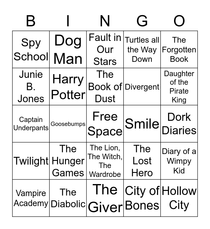 This bingo card has a free space and 24 words: The Hunger Games, The Diabolic, The Book of Dust, Vampire Academy, The Forgotten Book, Spy School, Junie B. Jones, Dog Man, Smile, The Lion, The Witch, The Wardrobe, Divergent, Captain Underpants, The Lost Hero, Diary of a Wimpy Kid, Harry Potter, City of Bones, Dork Diaries, Fault in Our Stars, Daughter of the Pirate King, Goosebumps, Hollow City, Twilight, Turtles all the Way Down and The Giver.