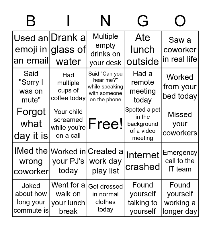 This bingo card has a free space and 24 words: Worked in your PJ's today, Went for a walk on your lunch break, Said "Can you hear me?" while speaking with someone on the phone, Joked about how long your commute is, Saw a coworker in real life, Used an emoji in an email, Said "Sorry I was on mute", Drank a glass of water, Spotted a pet in the background of a video meeting, Created a work day play list, Had a remote meeting today, Forgot what day it is, Internet crashed, Emergency call to the IT team, Had multiple cups of coffee today, Found yourself talking to yourself, Missed your coworkers, Multiple empty drinks on your desk, Worked from your bed today, Your child screamed while you're on a call, Found yourself working a longer day, IMed the wrong coworker, Ate lunch outside and Got dressed in normal clothes today.