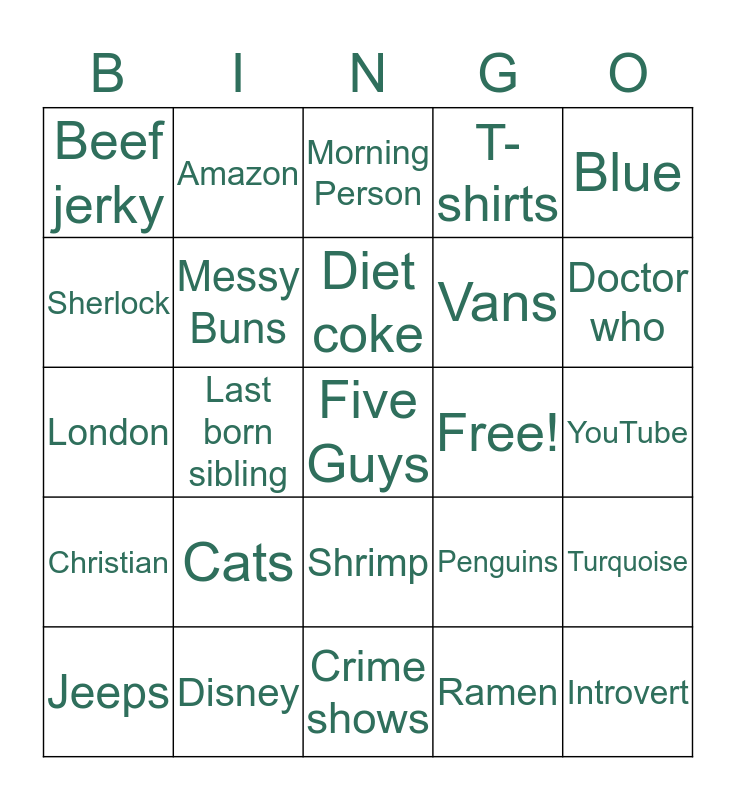 This bingo card has a free space and 24 words: Cats, Disney, Diet coke, Jeeps, Blue, Beef jerky, Sherlock, Amazon, Free!, Shrimp, Vans, London, Penguins, Turquoise, Messy Buns, Ramen, YouTube, Morning Person, Doctor who, Last born sibling, Introvert, Christian, T-shirts and Crime shows.