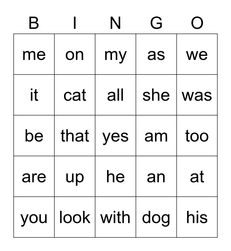 This bingo card has a free space and 24 words: up, look, all, you, we, me, it, on, am, he, she, be, an, at, cat, dog, too, my, was, that, his, are, as and with.