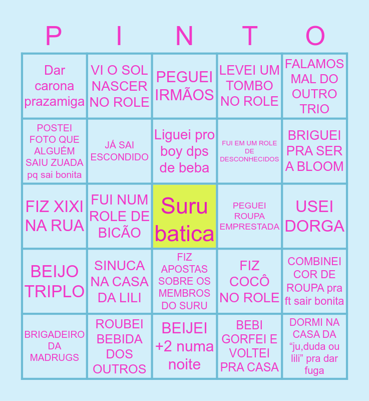 This bingo card has a free space and 24 words: SINUCA NA CASA DA LILI, ROUBEI BEBIDA DOS OUTROS, Liguei pro boy dps de beba, BRIGADEIRO DA MADRUGS, FALAMOS MAL DO OUTRO TRIO, Dar carona prazamiga, POSTEI FOTO QUE ALGUÉM SAIU ZUADA pq sai bonita, VI O SOL NASCER NO ROLE, PEGUEI ROUPA EMPRESTADA, FIZ APOSTAS SOBRE OS MEMBROS DO SURU, FUI EM UM ROLE DE DESCONHECIDOS, FIZ XIXI NA RUA, FIZ COCÔ NO ROLE, COMBINEI COR DE ROUPA pra ft sair bonita, JÁ SAI ESCONDIDO, BEBI GORFEI E VOLTEI PRA CASA, USEI DORGA, PEGUEI IRMÃOS, BRIGUEI PRA SER A BLOOM, FUI NUM ROLE DE BICÃO, DORMI NA CASA DA “ju,duda ou lili” pra dar fuga, BEIJO TRIPLO, LEVEI UM TOMBO NO ROLE and BEIJEI +2 numa noite.