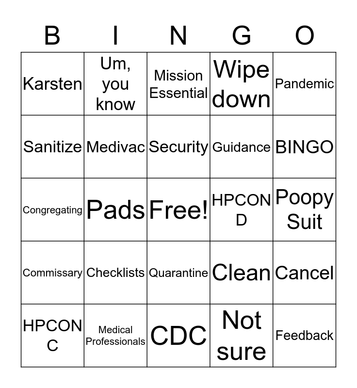 This bingo card has a free space and 28 words: Cancel, CONOPS, Guidance, Not sure, Sanitize, Mission Essential, Um, you know, Commissary, HPCON D, HPCON C, Congregating, Wipe down, Medical Professionals, CDC, BINGO, Wipes, Checklists, Medivac, Security, Quarantine, Karsten, Exposure, Feedback, Pads, Poopy Suit, Clean, Pandemic and Best team.