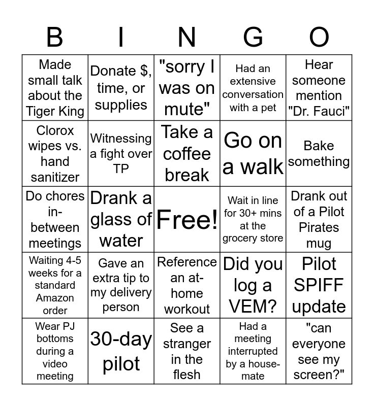 This bingo card has a free space and 29 words: Wear PJ bottoms during a video meeting, Spotted a pet in the background, Drank a glass of water, Spent too much time looking for zoom backgrounds, Made small talk about the Tiger King, "sorry I was on mute", Witnessing a fight over TP, Gave an extra tip to my delivery person, Wait in line for 30+ mins at the grocery store, 30-day pilot, Drank out of a Pilot Pirates mug, "can everyone see my screen?", See a stranger in the flesh, Had a meeting interrupted by a house-mate, Bake something, Forgot what day it was, Reference an at-home workout, Waiting 4-5 weeks for a standard Amazon order, Hear someone mention "Dr. Fauci", Do chores in-between meetings, Did you log a VEM?, Celebrate a healthcare worker, Go on a walk, Clorox wipes vs. hand sanitizer, Had an extensive conversation with a pet, Donate $, time, or supplies, Pilot SPIFF update, Take a coffee break and Joked about how long your "commute" is.