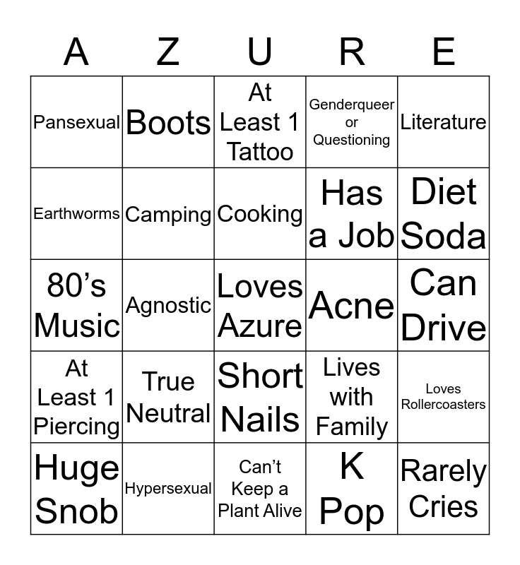 This bingo card has a free space and 24 words: True Neutral, Hypersexual, Cooking, Huge Snob, Literature, Pansexual, Earthworms, Boots, Acne, Short Nails, Has a Job, 80’s Music, Lives with Family, Loves Rollercoasters, Camping, K Pop, Can Drive, At Least 1 Tattoo, Diet Soda, Agnostic, Rarely Cries, At Least 1 Piercing, Genderqueer or Questioning and Can’t Keep a Plant Alive.